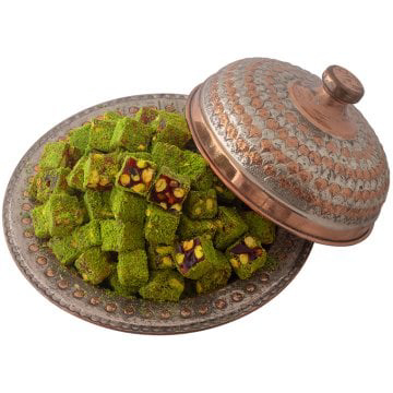 ستشعر بالفرق عندما تتذوق راحة الحلقوم المطلية بمسحوق الفستق بنكهة الرمان والكثير من الفستق الحلبي الذي يتم إنتاجه من بنجر السكر النقي دون استخدام الجلوكوز. مناسب للاستهلاك النباتي.